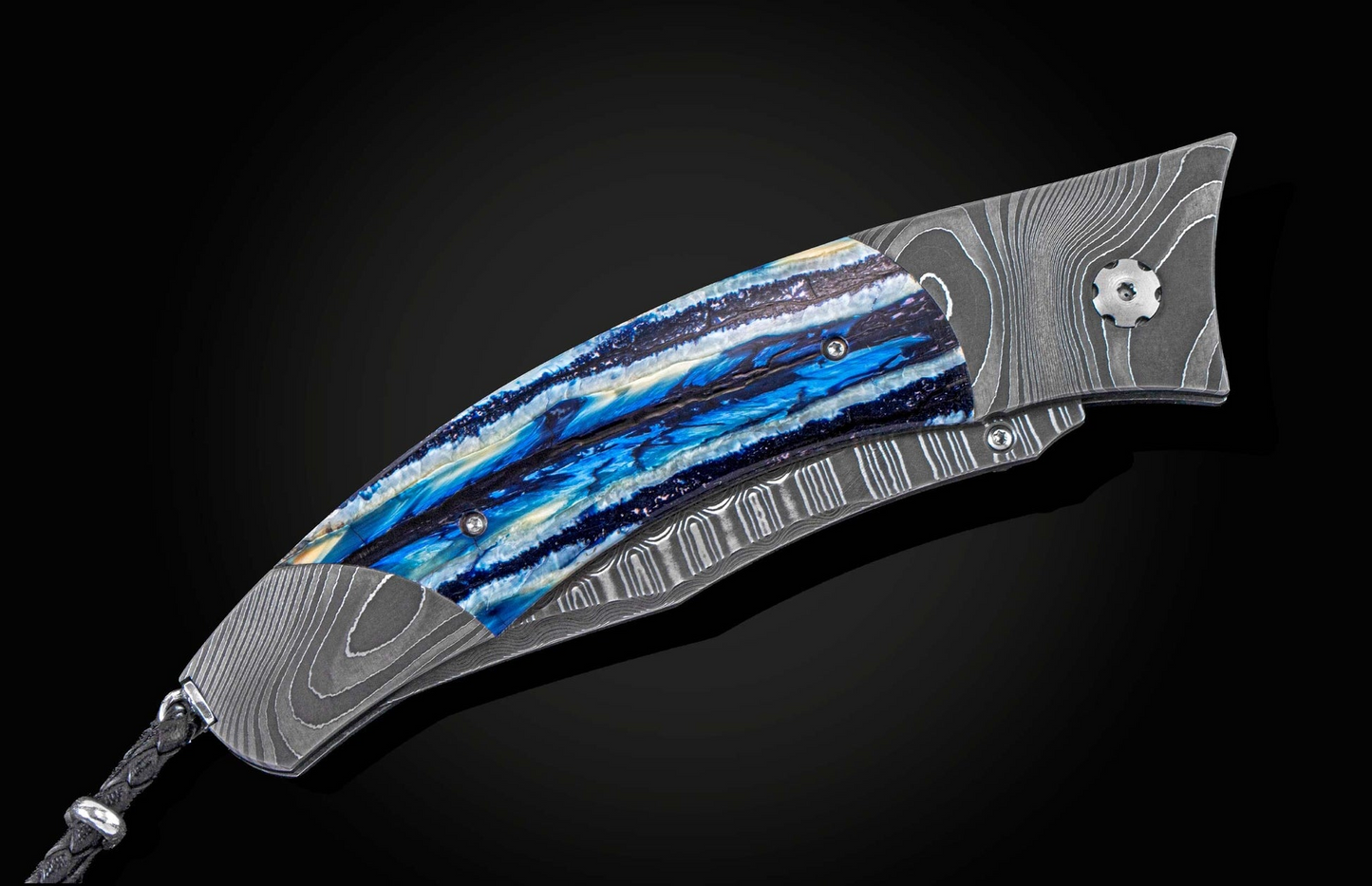 The Contour ‘Blue Wave' features a frame in hand forged 'Twist' damascus steel by Chad Nichols, inlaid with 10,000 year-old fossil Woolly Mammoth tooth. The blade is 'Wave' damascus steel with an extra strong core of VG-10. The one-hand button lock and the thumb stud are set with spinel gemstones.