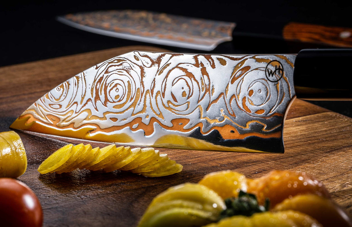 The new Kultro ‘Flare’ knife set is a stunning addition to our William Henry cutlery line. Our new Rainbow Damascus blades feature 34 layers of stainless steel, copper, and brass with a Japanese Hitachi Blue Steel core. These exquisite blades are finished with a beautiful Cocobolo and black lip pearl handle complete with your choice of display rack. For safe transport, they come with a sturdy leather knife roll. Like all William Henry creations, this kitchen set is sure to inspire curiosity and turn mundane tasks into an act of ceremony. Enjoy your time!