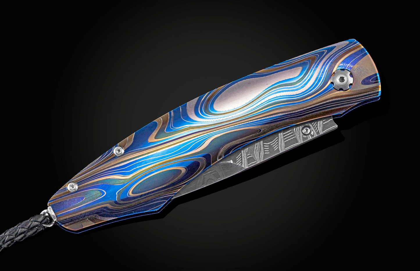 The Spearpoint ‘Blue Demon’ features a light and resilient titanium frame that is laser-engraved in color. The blade is hand-forged 'Hornets Nest' damascus by Mike Norris; the one-hand button lock and the thumb stud are set with London Blue topaz gemstones. A remarkable design that gives you an instrument with a full-size secure grip, and a versatile deep-belly blade, the Spearpoint epitomizes William Henry’s core philosophy – that superlative function deserves to be elevated to superlative art. The ‘Blue Demon’ features the perfect balance between elegance, function, and hi-tech materials; a distinctive personality statement to be worn and used for a lifetime.