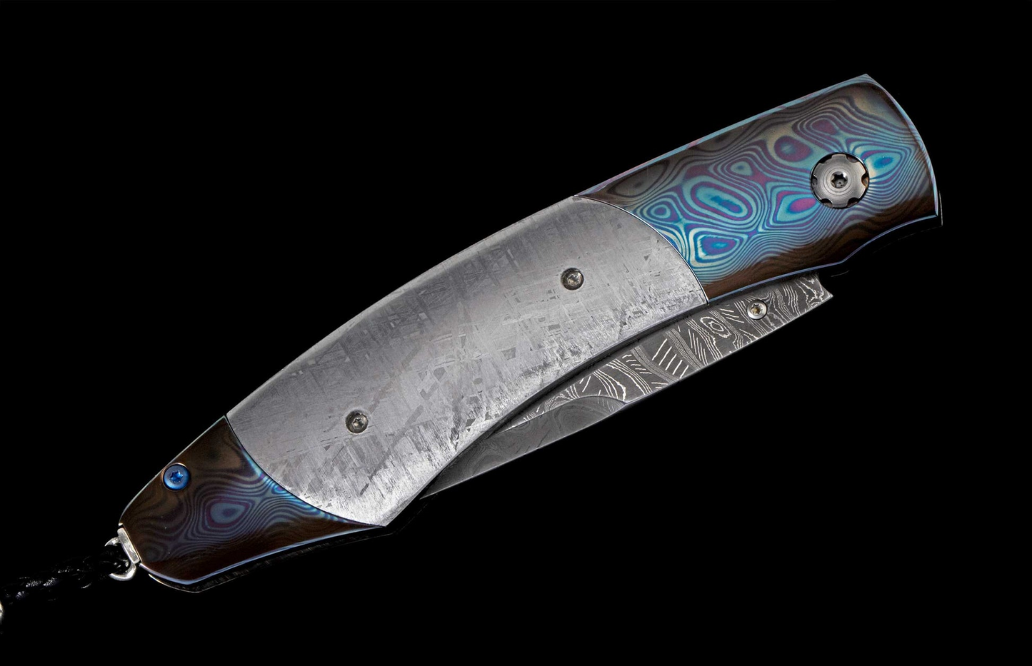 The Spearpoint 'Aurora II' features a beautiful frame in heat-blued & hand-forged damascus, inlaid with a mesmerizing meteorite scale (a section of the Gibeon meteorite which fell in the desert of Namibia in prehistoric times). The blade is hand-forged 'Hornets Nest' damascus by Mike Norris; the one-hand button lock and the thumb stud are set with sapphires. A remarkable design with a full-size secure grip and versatile deep-belly blade, the Spearpoint epitomizes William Henry's core philosophy: superlative function deserves to be elevated to superlative art. The 'Aurora II' features some of the exotic materials that are the hallmark of William Henry's collections; a timeless heirloom to be proudly worn and used for a lifetime.