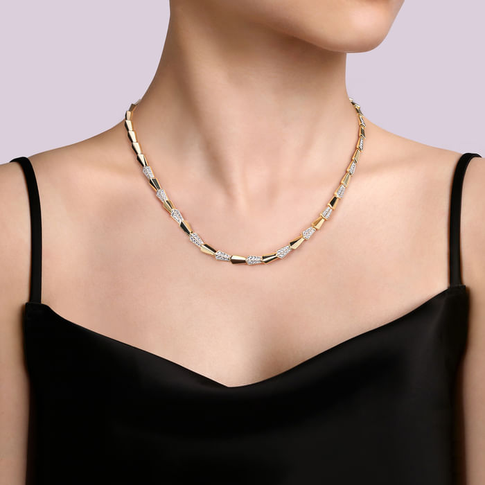 14k yellow gold necklace with diamond pave in alternating 14k white gold chevron style links, 1.54ctw, GH-SI quality. This necklaces is 16 inches long and the links are close to 5mm wide.